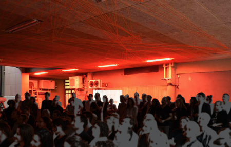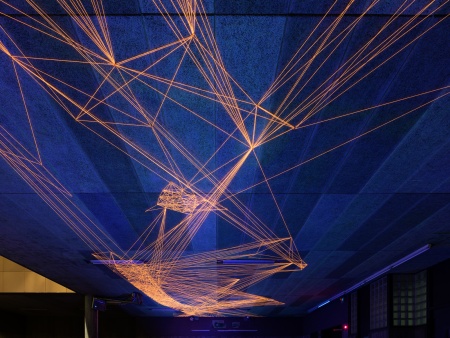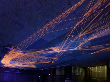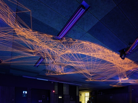 Für den Launch Event der Architekturplattform TRANSFER-Arch wurde die Bakelit-Decke eines Garagen-Innenhofs mit fluoreszierenden Schnüren bespannt. Das Muster zeigt die weltweiten Internetverbindungen zwischen den Metropolen, dies nach dem Bild von Chris Harrison 'Internet Map. World Citiy -to-City Connections'.