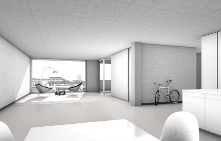 Die Lebensweise, bei der Wohnen und Arbeiten fliessend ineinander übergehen, widerspiegelt sich in der Typologie und in der Art der Nutzung des Gebäudes. Sowohl die 'Offenen Räume' wie auch die Wohnungen in den oberen Geschossen sind grossflächig angelegt, sind nur beschränkt unterteilt und verfügen über hohe Räume. Während sich die Zonierung in den 'Offenen Räumen' in der Vertikalen vollstreckt, entfalten sich die Wohnungen der oberen Geschosse in der Horizontalen.